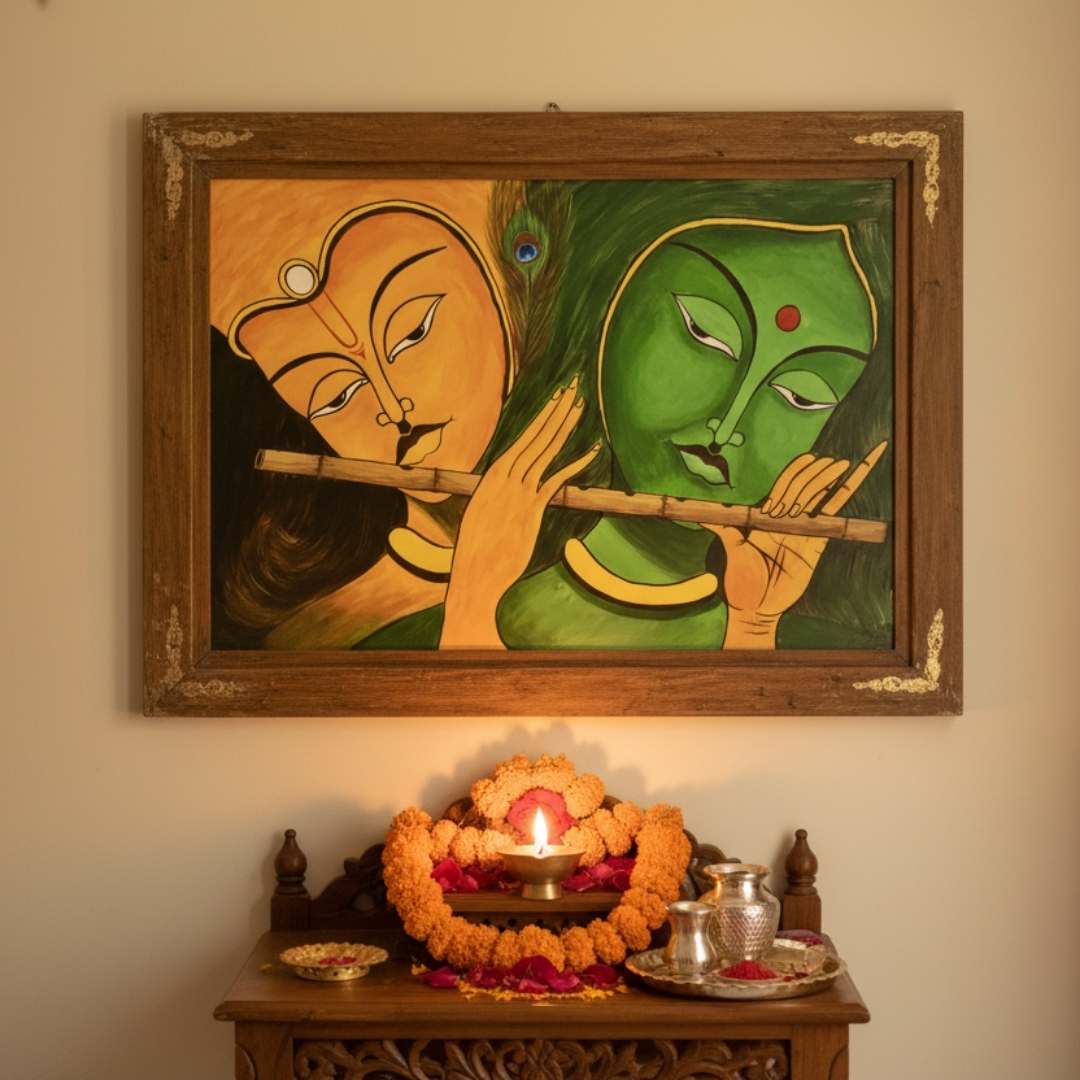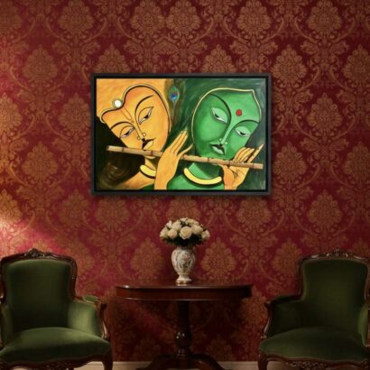 This piece transcends mere decoration—it embodies devotion, peace, and the timeless union of divine love. Ideal for a prayer room or a meditative space, it radiates warmth and positivity, inviting introspection and spiritual calm. The composition seamlessly integrates art, spirituality, and tradition, celebrating the divine music of life that flows through Radha and Krishna’s eternal bond.