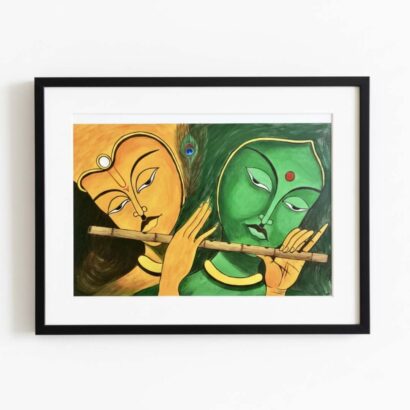 This captivating artwork beautifully portrays the divine love and spiritual connection between Lord Krishna and Radha, symbolizing the eternal harmony of the soul and the universe. The painting, rendered in warm earthy tones of yellow and green, exudes serenity and devotion. Krishna, depicted with a calm, golden face, gently plays the flute, while Radha, painted in soothing green hues, listens with a tranquil expression, embodying love, devotion, and surrender. The peacock feather subtly placed in the background signifies Krishna’s divine presence and celestial grace.