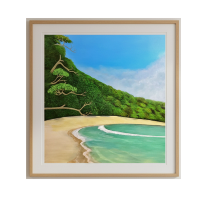 The painting is set in a simple, light wood frame with a white matte border that enhances its natural aesthetic. “Emerald Cove” is ideal for spaces meant to inspire relaxation and escape, such as bedrooms, lounges, or coastal homes. It is a visual sanctuary—quiet, radiant, and eternally peaceful. A moment of coastal bliss captured on canvas.