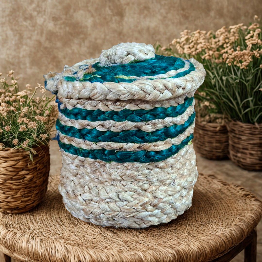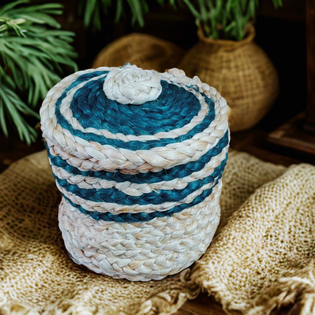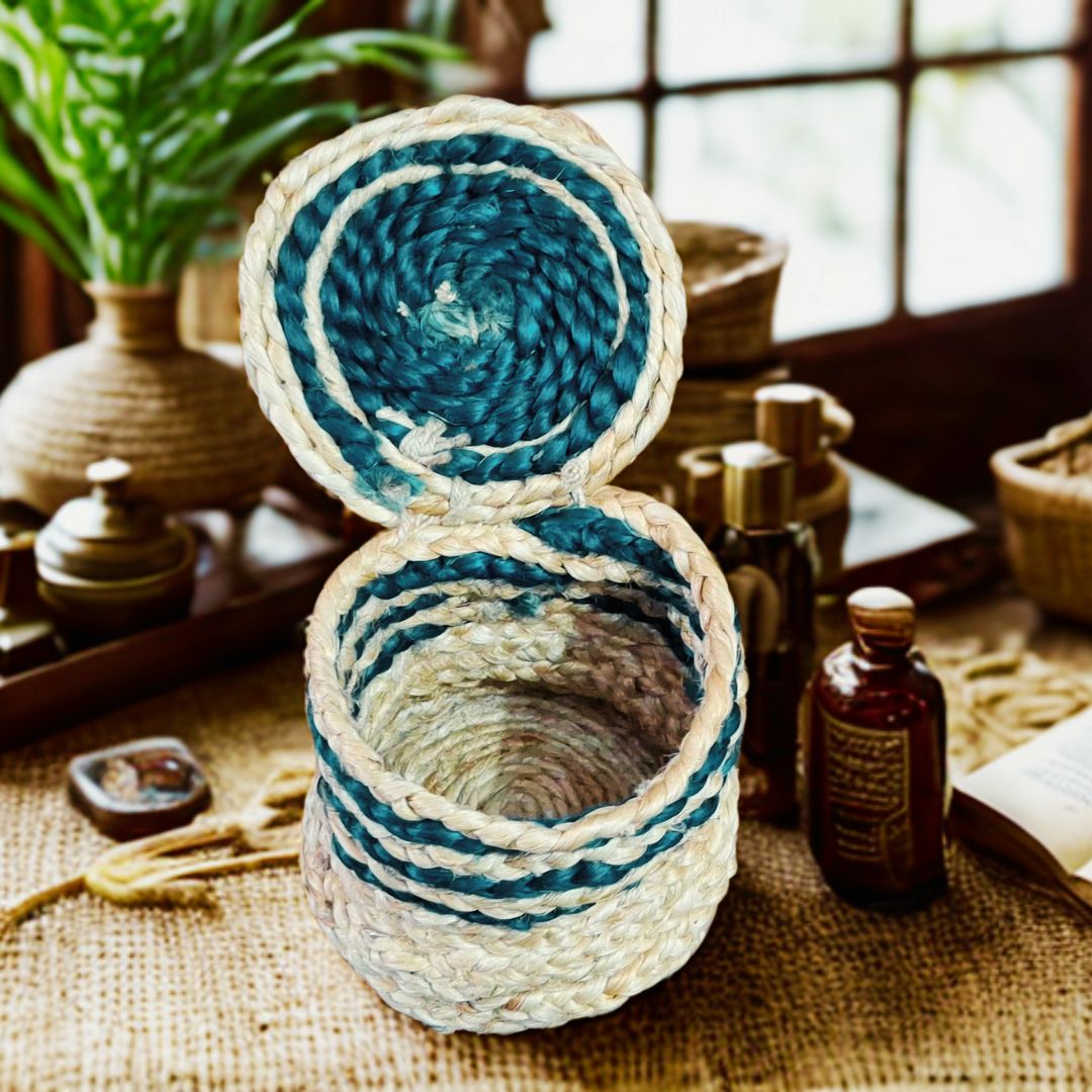 This charming utility box is a small yet functional storage solution crafted from natural jute with elegant blue accents. Handwoven by skilled artisans, it embodies the perfect blend of traditional craftsmanship and modern utility. The cylindrical design is compact, making it ideal for organizing small items while adding a rustic touch to any space.