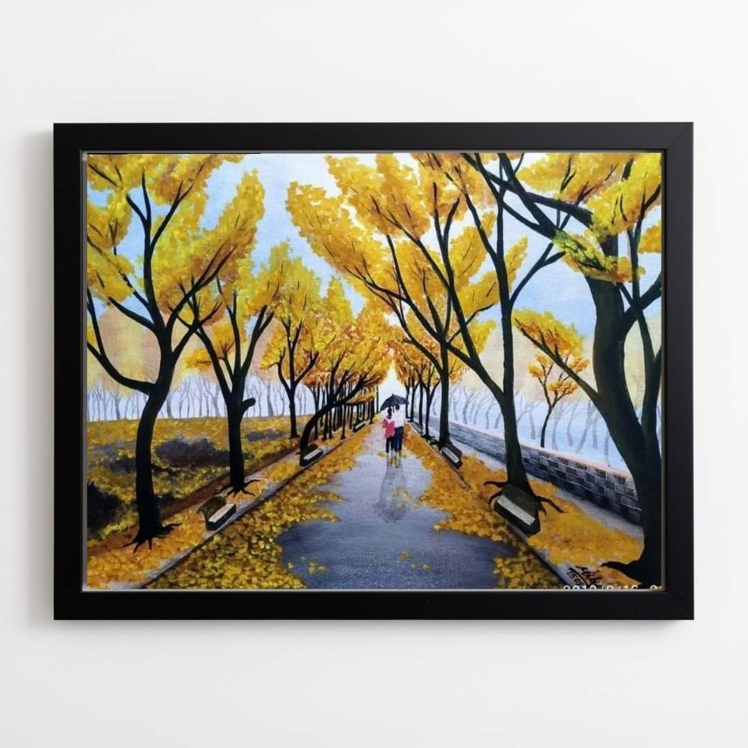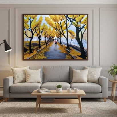 The use of perspective skillfully guides the gaze into the distance, creating a feeling of endless continuity — much like the flow of life itself. Framed in sleek black, this artwork blends modern elegance with emotional warmth, making it a perfect piece for homes, offices, or art galleries. Golden Pathway is not just a visual treat but an emotional escape — a reminder to pause, breathe, and cherish the fleeting beauty of moments shared amidst nature’s golden embrace.