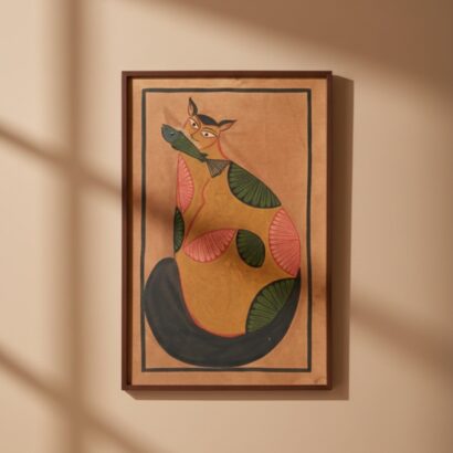 A painting – Greedy Cat Pattachitra Painting of a big fat greedy cat who stole a fish from the kitchen. When he gets coted he is trying to run away. This is a very out-of-the-box painting. Can be a good gift for your pet lover friend and also for you. Well decoration for bed room also with this Greedy Cat Pattachitra Painting.