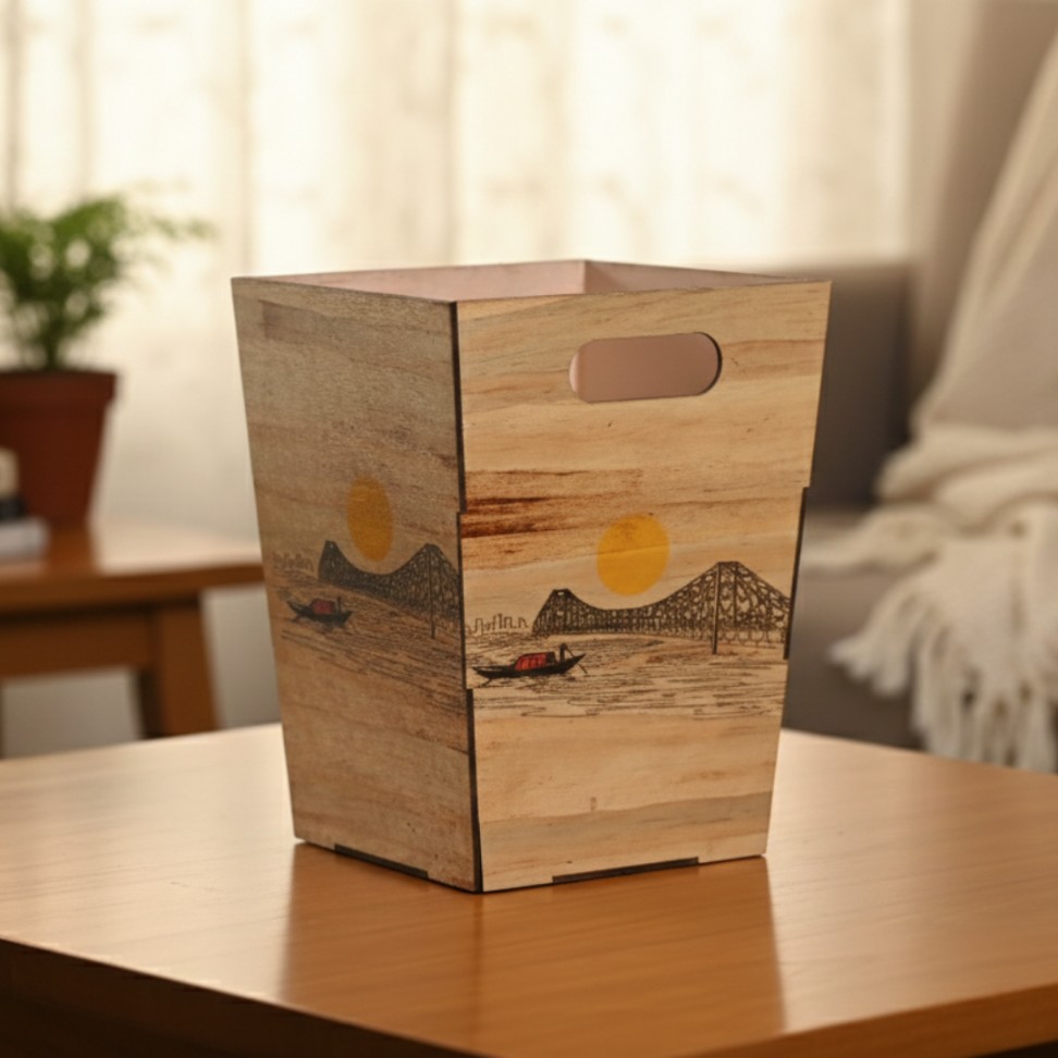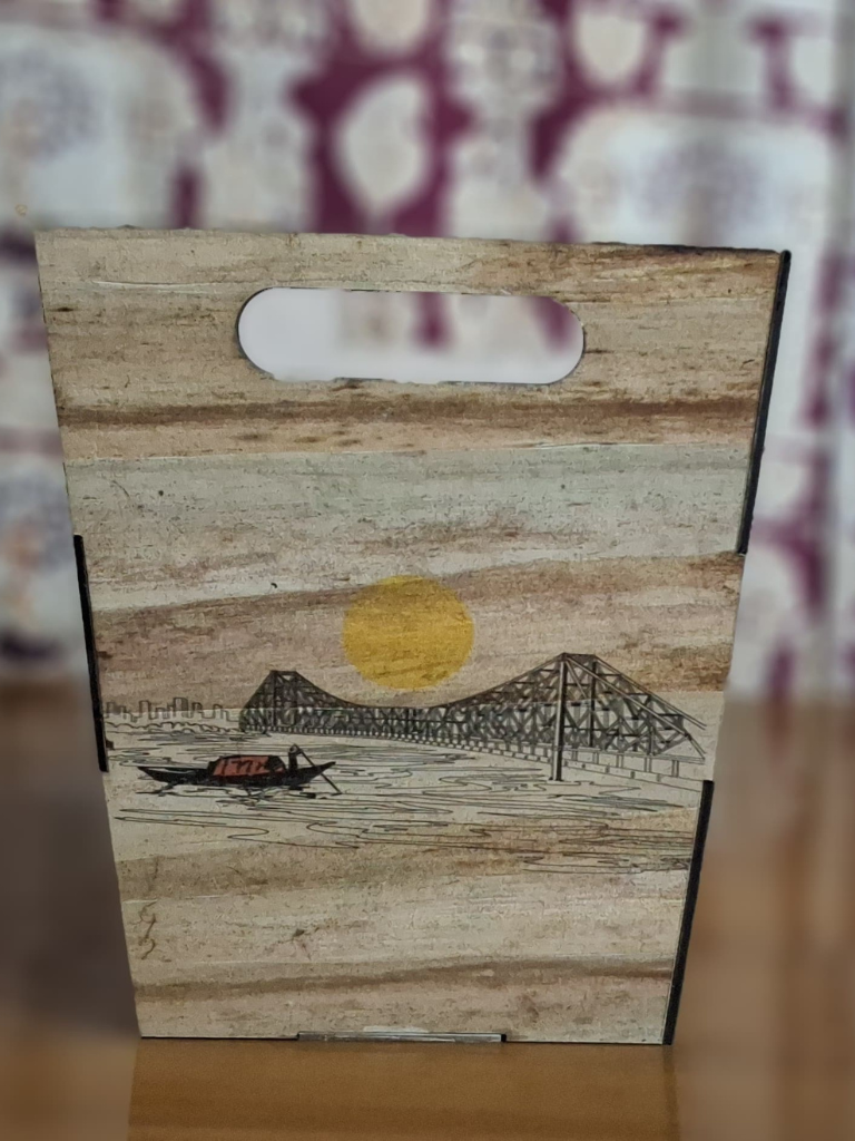 This handcrafted item is a beautifully designed eco-friendly dustbin bag made of natural materials, likely water hyacinth, showcasing traditional Bengal artistry. The front panel features a hand-drawn scene of Kolkata’s iconic Howrah Bridge, bathed in the warm hues of a setting or rising sun. Beneath the bridge, a traditional boat glides through the serene river, representing the timeless connection between the city and the Ganges.