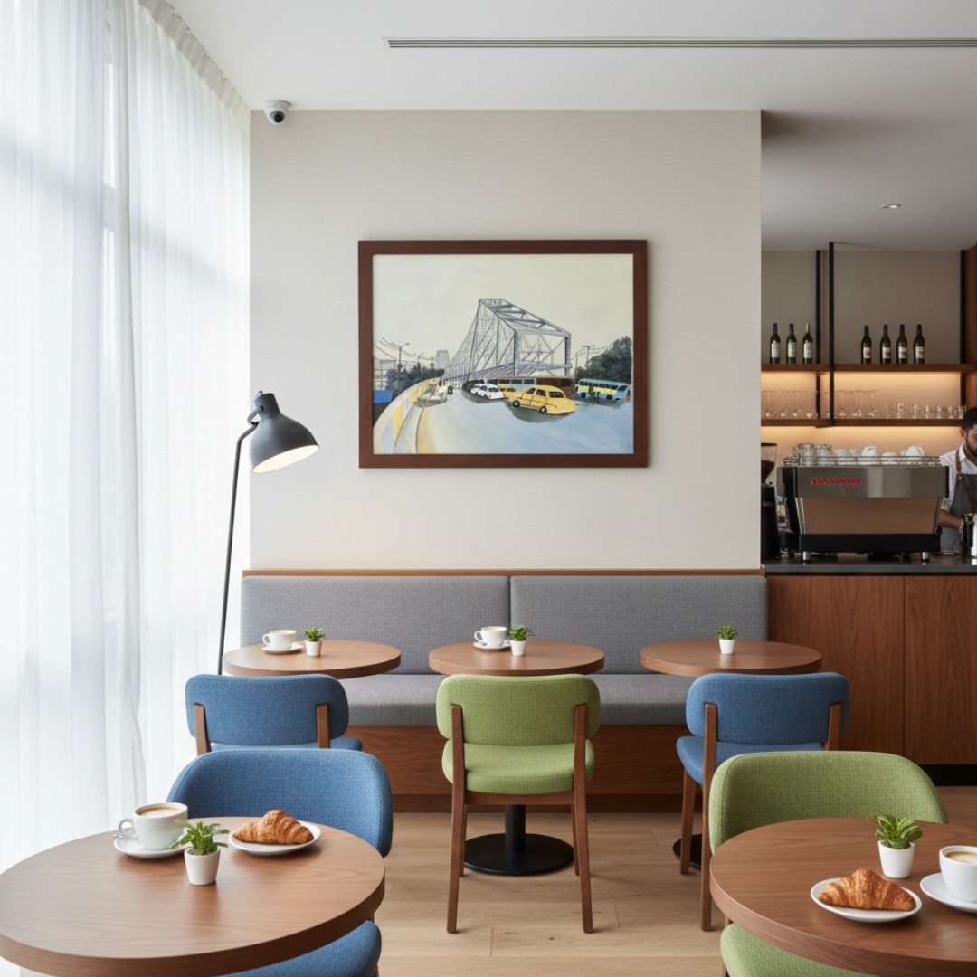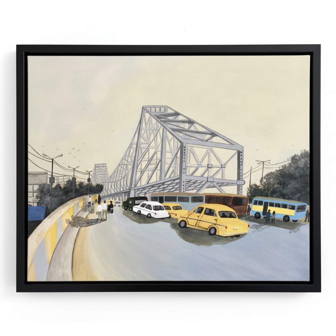 Celebrate the spirit of Kolkata with this stunning hand-painted artwork featuring the iconic Howrah Bridge, one of India’s most recognized landmarks. Captured in a soft, slightly overcast palette, this framed canvas beautifully blends urban realism with artistic charm. The massive steel structure of the bridge stretches across the canvas, its bold, geometric lines contrasting with the gentle hues of the sky and the fluidity of everyday street life below.