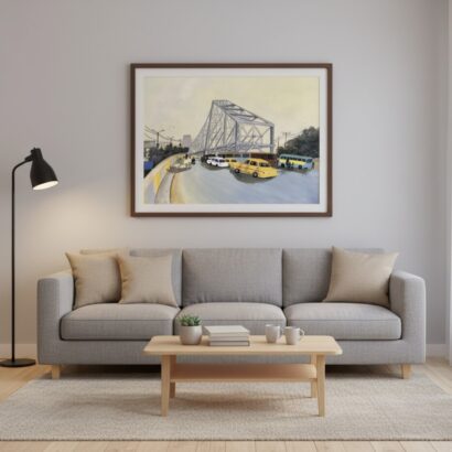 Framed in a sleek black border, this piece is perfect for homes, offices, or cultural spaces seeking a connection to India’s heritage and urban identity. Whether you’re a Kolkata native, a traveler, or simply an admirer of cityscapes, this artwork serves as a nostalgic reminder of the vibrancy, motion, and architectural beauty of the “City of Joy.” A must-have for lovers of Indian art and metropolitan scenes.