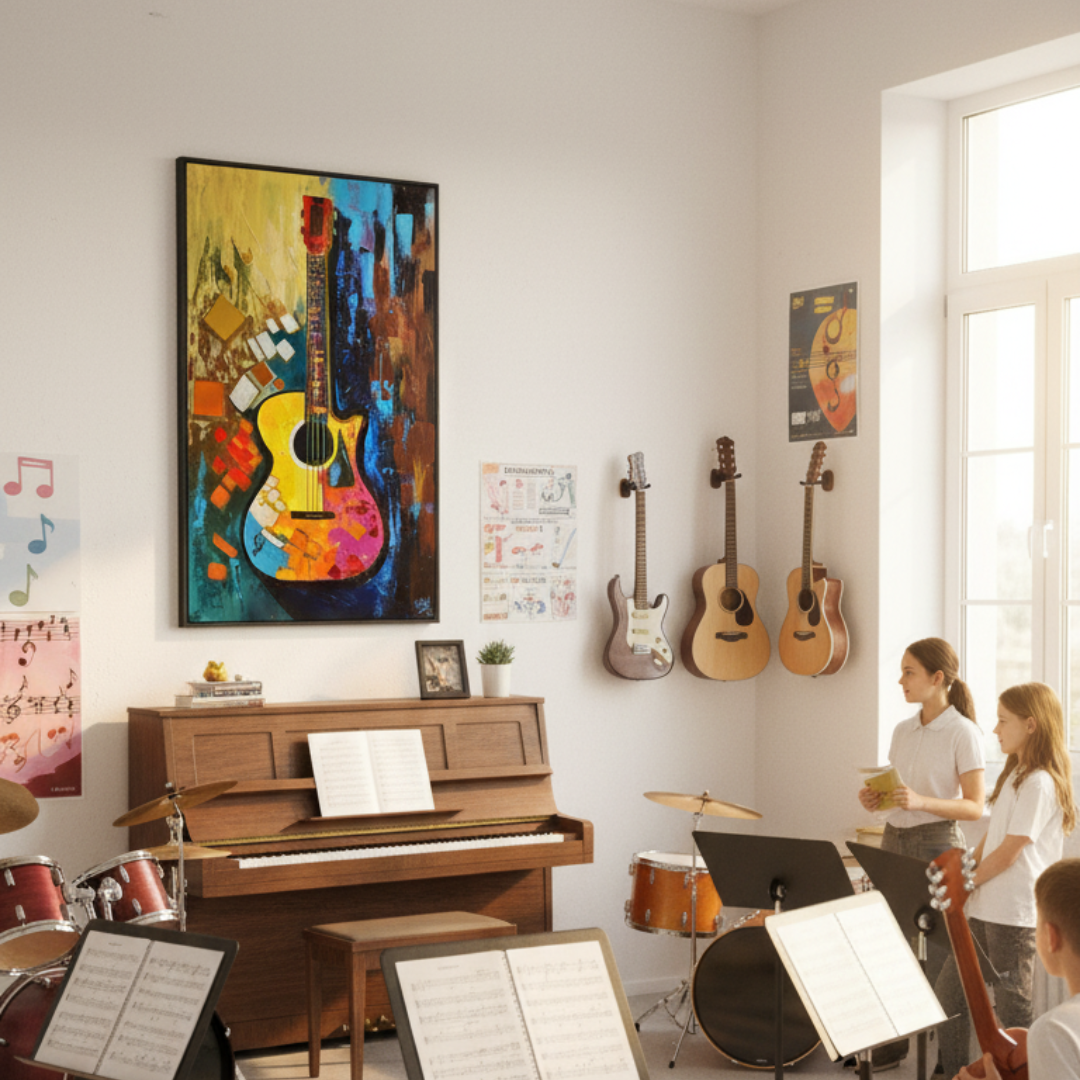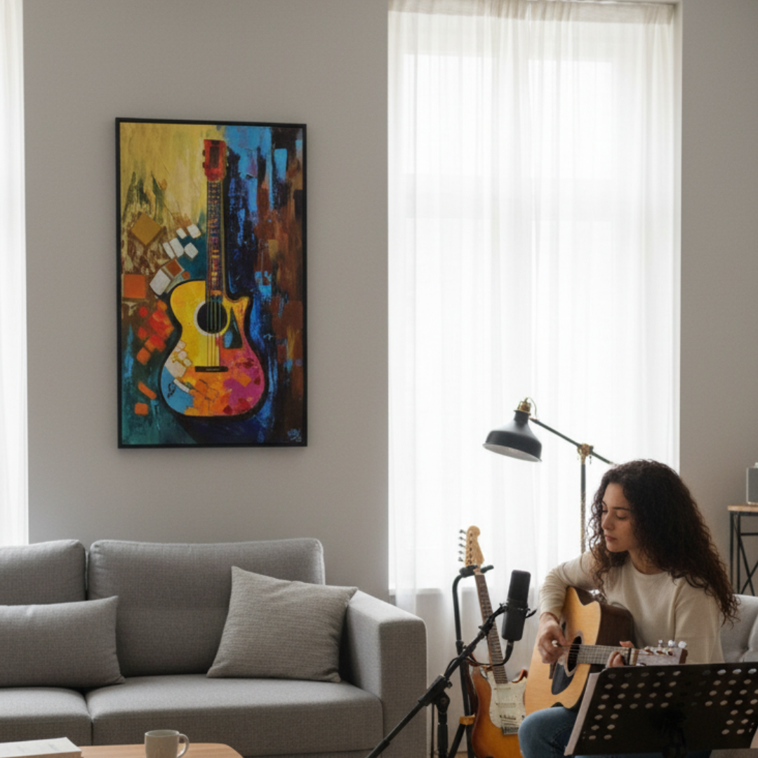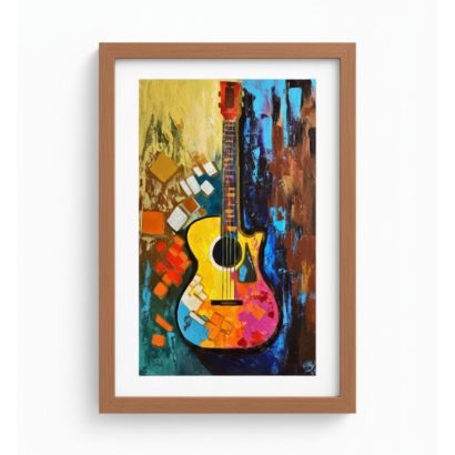Melody in Color” is a striking abstract painting that celebrates the harmony between music and art through an explosion of vibrant hues and dynamic forms. At its heart lies a beautifully stylized acoustic guitar, rendered in a kaleidoscope of colors — warm yellows, passionate reds, tranquil blues, and radiant pinks. The artist transforms this familiar instrument into a visual symphony, where each color and brushstroke echoes the rhythm and emotion of a song.