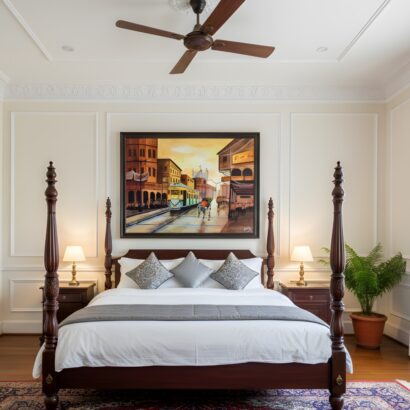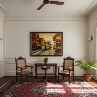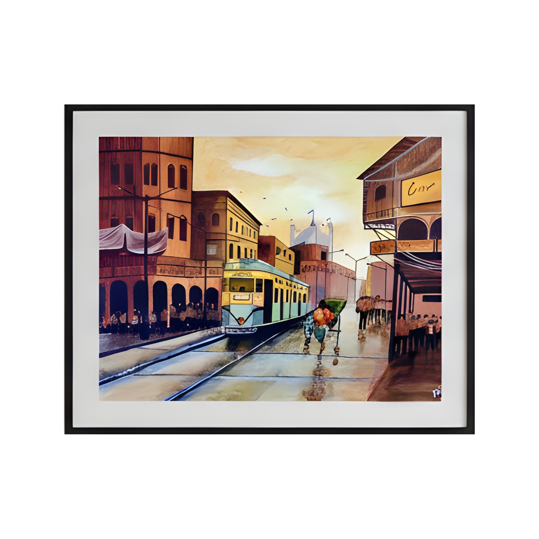 Bring a touch of nostalgia and urban charm to your space with the “Old City Tram” Framed Wall Art Print. This evocative artwork captures a bustling street scene from a bygone era, where a classic yellow tram makes its way through narrow lanes flanked by colonial-style buildings. The artist has beautifully blended warm hues of amber, terracotta, and gold with cooler shades of blue and green to convey the vibrancy and motion of city life.