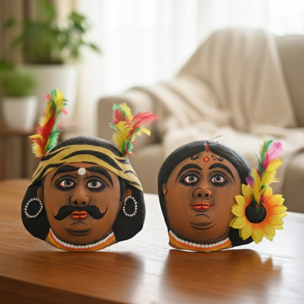 The tribal mask associated with the age-old dance form called Chau of the Purulia region of West Bengal is acclaimed for its craftsmanship. The mask is basically made of clay for robustness and durability, and the clay is locally available from the river Marangburu. This is a fair-toned demon face mask painted in pastel shades. The red bandana and the feathers tucked on give the mask an overall artistic look. The eyebrows, hair, mouth, and eyes are painted in such a way, which gives this mask a special effect and makes it look complete. This mask is perfect for your living room or bedroom area. This mask is a perfect example that how much Purulia locals are attached to art, culture, and history. No harsh chemicals are used. Dyed with vegetable and floral colors. Made with love by the rural artisans of Bengal.