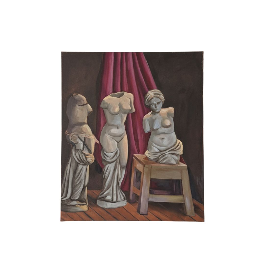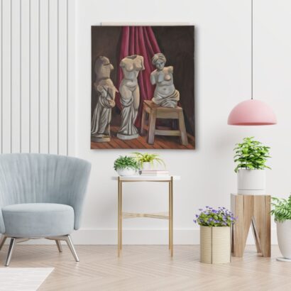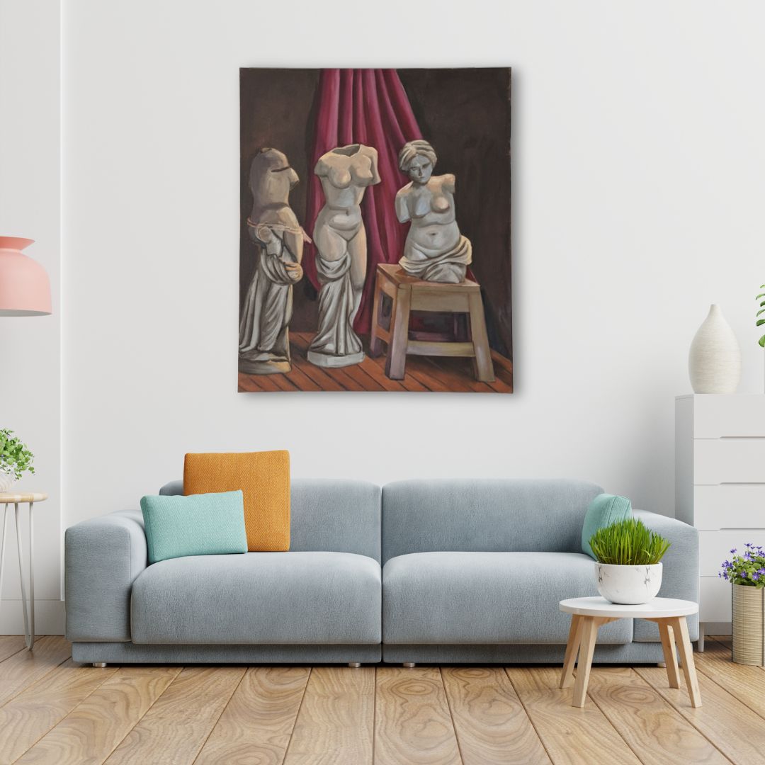 Silent Figures of Time is a mesmerizing painting that pays homage to the enduring beauty of classical sculpture and the quiet poetry of imperfection. The artwork features three marble statues — each fragmented, each bearing the marks of time — arranged thoughtfully within an intimate setting. The central figure, headless yet poised, stands tall as a symbol of grace preserved through decay. To her left, a smaller figure, partially draped, hints at humility and fragility. To the right, a seated bust gazes softly downward, embodying reflection and vulnerability.