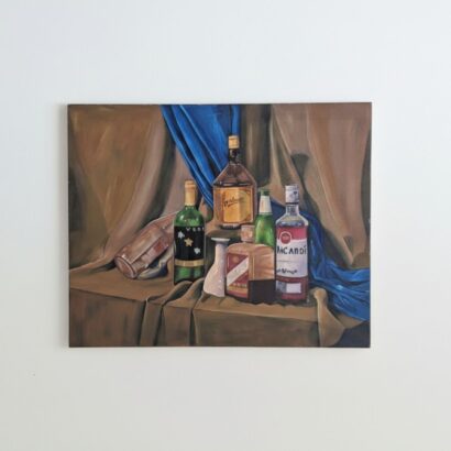 The warm brown drapery forms the foundation of the scene, while the contrasting blue fabric in the background introduces a sense of balance and richness. This interplay of color and texture adds visual depth and invites the viewer to linger on the subtleties of light, shadow, and reflection. The bottles’ arrangement feels spontaneous yet deliberate, creating a rhythmic visual harmony that draws the eye across the canvas.