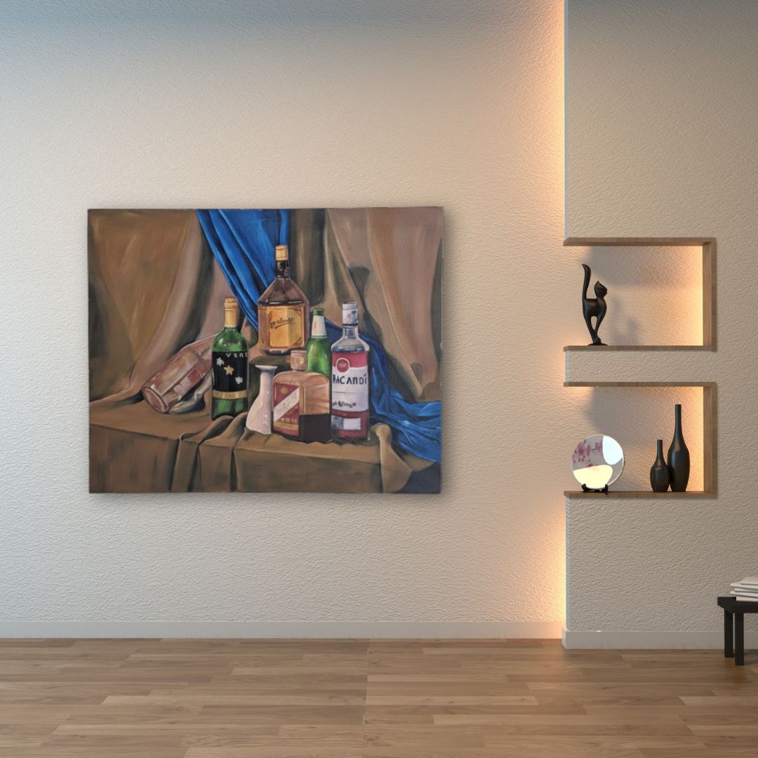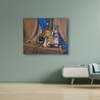 Beyond its aesthetic appeal, the painting evokes themes of leisure, time, and contemplation. The collection of bottles can be interpreted as remnants of social gatherings, quiet reflections, or celebrations past — each vessel holding a story within. The soft folds of the fabric, combined with the glimmer of glass, lend the piece a timeless elegance that blends classic still-life traditions with modern sensibilities.