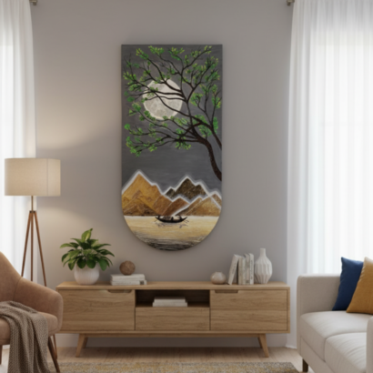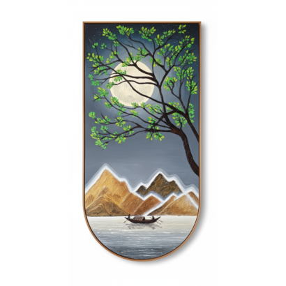 This elegant painting, titled “Tranquil Moonlit Journey”, captures a serene nocturnal landscape that blends natural elements into a harmonious composition. The artwork is presented within a unique arched frame that softens the scene, giving it a dreamlike quality reminiscent of ancient scroll paintings or modern wall niches.