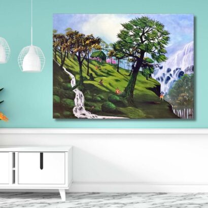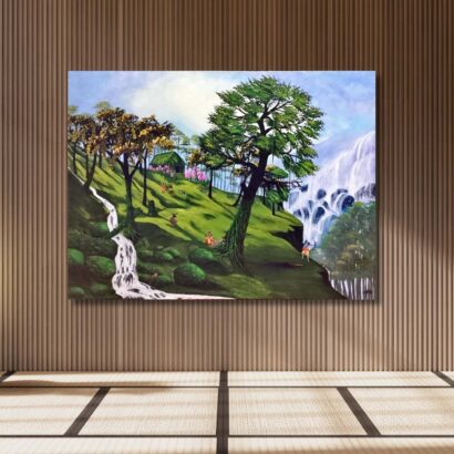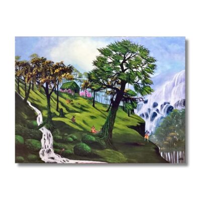 Through this painting, the artist celebrates the sacred connection between humans and their environment. It is not merely a landscape but a poetic reflection of peace, purity, and balance. “Whispers of the Hills: A Symphony of Nature” invites viewers to pause, breathe, and listen—to the rustling leaves, the flowing waters, and the timeless whisper of the earth itself.