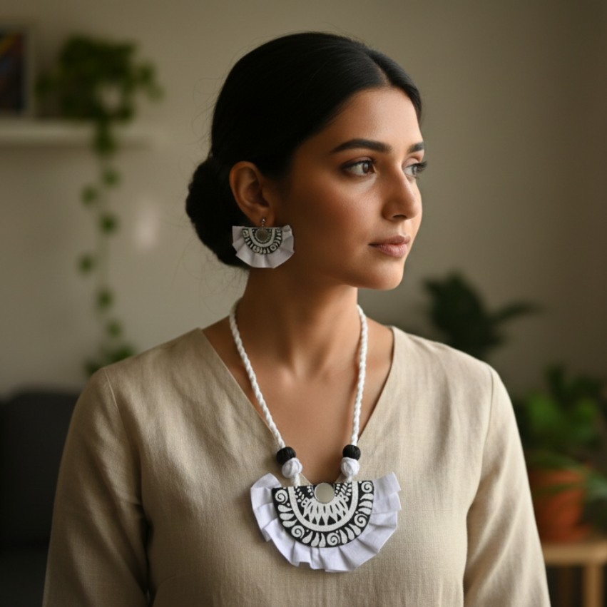 Indulge in luxury with our White Pleated Neckpiece Set, a must-have accessory for the modern fashionista. The wooden base, enveloped in sumptuous black fabric, is meticulously handpainted with vibrant acrylic colors to create a one-of-a-kind design. The delicate white fabric pleats add a touch of sophistication, while the mirror, cotton ball, and thread lace embellishments exude elegance. Complete your ensemble with the included earring hooks for a glamorous finishing touch.